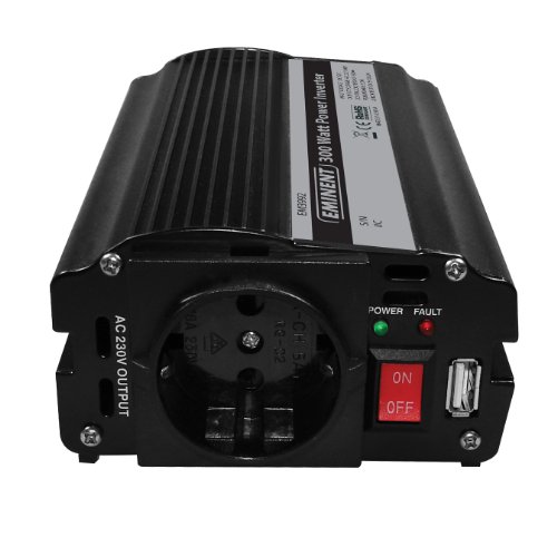 - Der EM3992 12 V zu 230 V Wechselrichter liefert 300 Watt Dauerleistung und 600 Watt Spitzenleistung. Viele Geräte wie TV-Geräte, Mediaplayer, Laptops/Notebooks, Kühlboxen, Pumpen usw. können ohne Probleme angeschlossen werden.